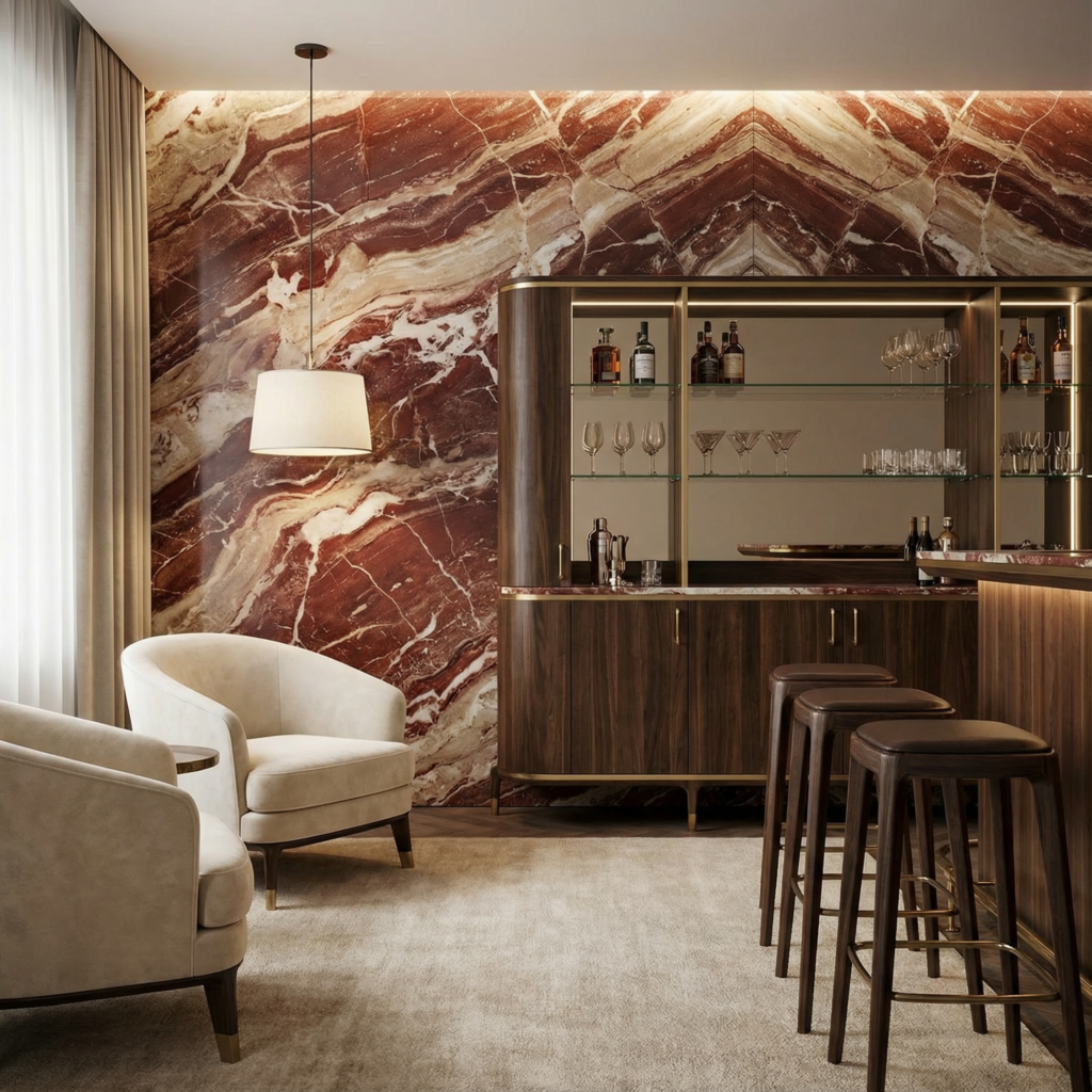 Dans un salon, une bibliothèque, un espace bar ou un vestibule, une seule paroi suffit à créer un point focal fort et immédiatement identifiable. On peut aussi l’utiliser sur des parois courbes : ses veinules, naturellement fluides, accompagnent la courbe et renforcent l’impression sculpturale, presque architecturale. L’équilibre se joue dans le contraste : murs adjacents plus calmes, éclairage précis, et matières mates autour pour laisser la pierre capter la lumière. Utilisé avec retenue, le Lepanto Rosso transforme le mur en véritable élément de décor, sans alourdir l’espace, mais en lui apportant profondeur, rythme et caractère.