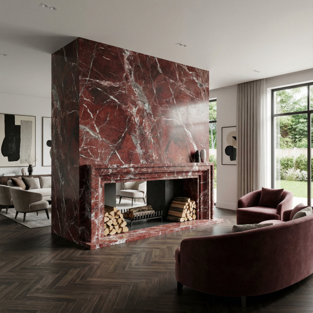 Son comportement face à la chaleur permet de l’envisager en habillage de cheminée ou en proximité d’une zone chaude, à condition d’éviter les chocs thermiques brutaux et d’opter pour des traitements adaptés à la pierre naturelle. Le résultat, lui, est incomparable : le pourpre intensifie la sensation de foyer, tandis que les veinules blanches deviennent une lumière à part entière, même lorsque le feu est éteint. Le Lepanto Rosso apporte alors une dimension presque scénographique à l’espace, transformant la cheminée en un élément central, à la fois chaleureux, élégant et profondément architectural.